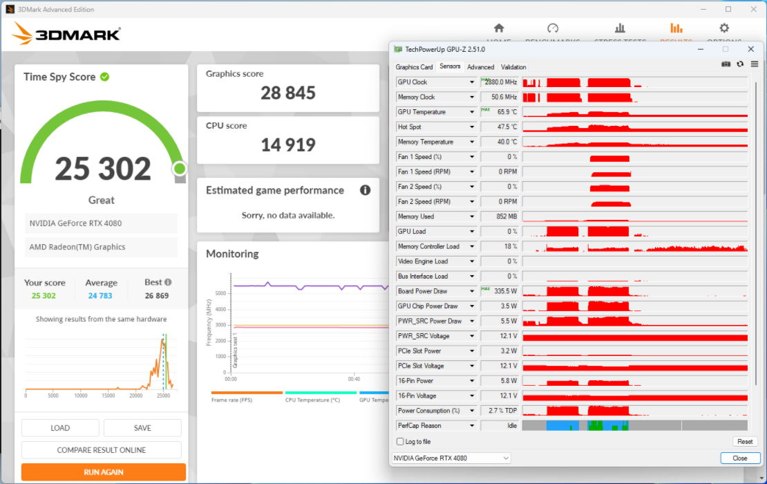 技嘉RTX 4080 AERO雪鹰默认的最高加速频率为2535MHz,在3DMark测试中,显卡的最高频率跑到了2880MHz,这是一个非常不错的成绩了。
