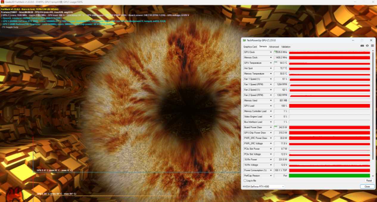 在经过了40分钟的考机测试后,技嘉RTX 4080 AERO雪鹰的GPU最高温度不过64.3℃,风之力散热系统表现强悍,而且就算是在满载状态下,也几乎听不到风扇噪声。功率方面,可以看到考机最高功率342.5 W,和游戏中的最高功率相差不大,可见性能释放是很到位的。