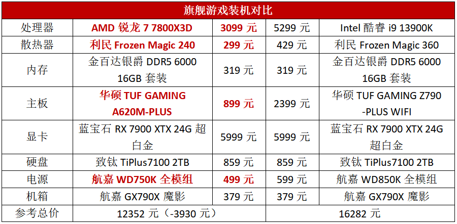 同时得益于锐龙7 7800X3D相当优秀的功率控制,其对于搭配的电源、散热器的要求也更低,反映到价格上就是更便宜。因此这套基于锐龙7 7800X3D的旗舰游戏配置,可是便宜了将近4000元,算得上是相当大的优势了。
