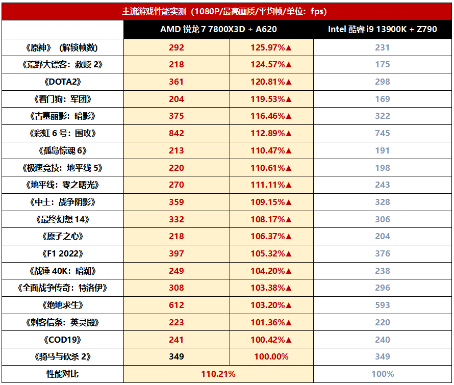 在主流的电竞网游和3A大作当中,有了巨大三级缓存和高能效5nm Zen4架构的加持,锐龙7 7800X3D在各类游戏中都表现出了极为强悍的性能,其中《原神》的领先幅度最大,达到了将近26%,平均下来也超过了10%,这表明该处理器的综合成绩已经明显超越了竞品旗舰酷睿i9 13900K。