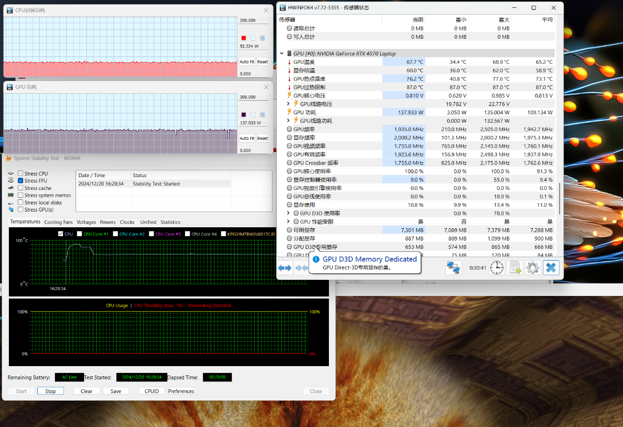▲将机身垫高开启一键强冷,双考30分钟后,i9-14900HX的封装功耗稳定在52W,而RTX 4070的功耗大约在135W~138W之间,整机功耗释放达到了190W高水准。