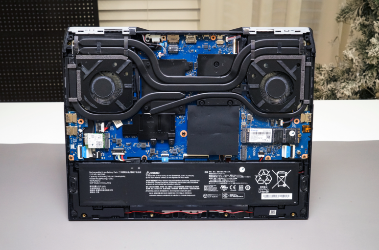 ▲雷神ZERO 2024内部一览,可以看到主板硬件排布非常规整,散热模组覆盖了主板上大面积区域。并且双插槽内存和第二个SSD位一目了然,无线网卡位置安排也很合理。