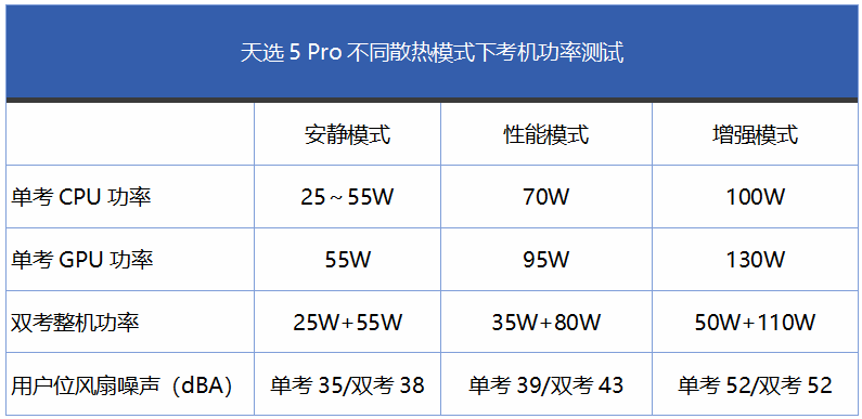 再看看双考的表现,安静模式下双考是CPU25W +55W,用户位噪声约38dBA,同样的,完全不用担心满载时的风扇噪声问题,整机80W的性能输出,能够应对网游或者要求不高的3A游戏(关于性能后面有详细的对比测试);让人惊喜的是性能模式下,双考表现是CPU 35W+GPU 80W,而用户位噪声也不过43dBA左右,几乎是轻薄本满载的噪声表现,但整机的综合性能达到了115W,可算是相当不错了;增强模式,就是大家在测评中都能见到的表现,CPU 50W +GPU 110W,算是该机的满血输出模式,但噪声控制得还不错,和单考一样都是52dBA,能听到较明显风扇噪声,但不是起飞的级别。