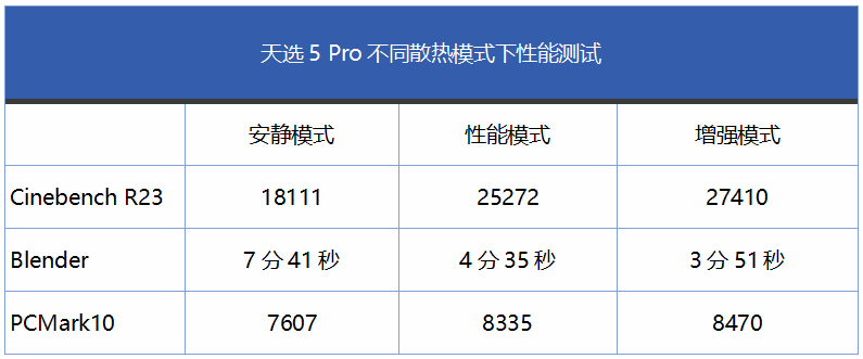 至于轻度日常使用,三种散热模式都丝毫没有问题,PCMark10的分数就说明了这点儿。而且对于绝大多数轻度应用来说,性能模式是更好的选择——基本不用担心天选5 Pro的风扇噪声,轻度办公类应用性能也几乎没有损失。