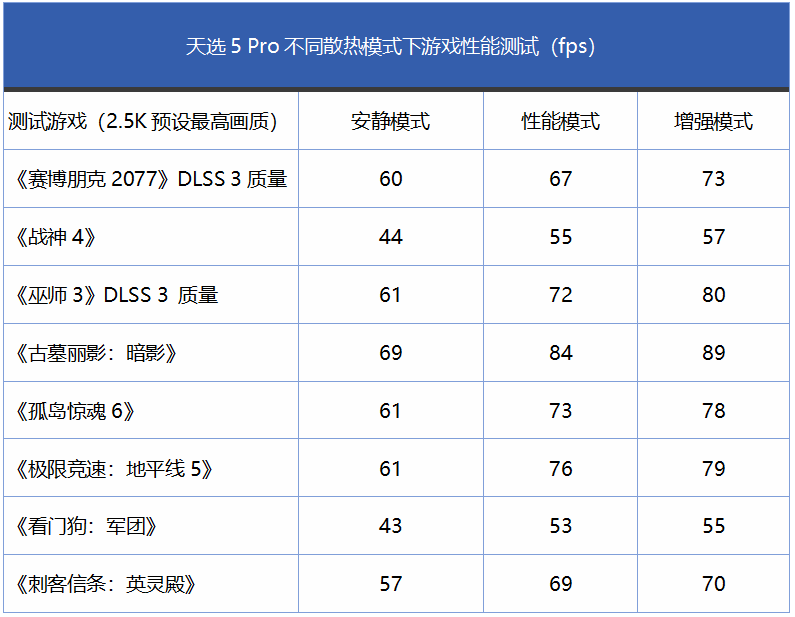 性能模式下,应该说这是天选5 Pro在使用体验和功率输出上更均衡的选择。一方面,相比安静模式,整机输出功率提升到了115W,游戏帧速也大幅度提升了,比如《战神4》从44fps上升到了55fps,原本平均帧速为61fps的《孤岛惊魂6》和《极限竞速:地平线5》分别提升到了73fps和76fps,流畅性进一步提高。另一方面,相比增强模式差距不大,很多游戏差距都微乎其微。