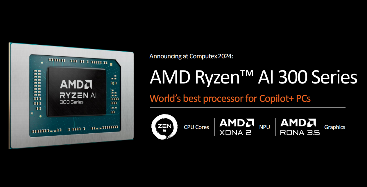 AMD在2023年初推出的锐龙7040系列是全球首款内置XDNA架构NPU的X86处理器,接下来在2023年底,AMD进一步推出了锐龙8040系列,将NPU的算力提升了60%,达到了16TOPS,整体算力也升至39TOPS。而在6月3日,AMD终于正式发布了拥有Zen5架构CPU、内置XDNA2架构NPU和RDNA3.5架构GPU的锐龙AI 300系列移动处理器,将AI PC带入了新的纪元。