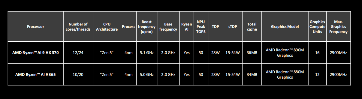 锐龙AI 9 365拥有10核20线程,其中包括4个Zen5核心和6个Zen5C核心,最高加速频率5GHz,拥有34MB(L2+L3)缓存,它也内置了锐龙 AI 9 HX 370同款NPU,拥有50TOPS强悍算力。集显方面,它内置了Radeon 880M,拥有12个CU(加速频率2.9GHz)。