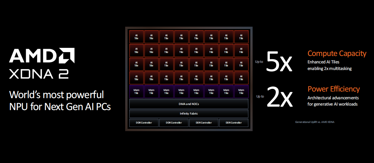 显而易见,锐龙AI 300系列移动处理器的杀手锏就是这个XDNA2架构的NPU了,相对上代架构来讲,它的规模大大增加,拥有五倍的计算性能和两倍的多任务性能与能效表现,堪称全球新一代AI PC中最强的NPU。此外,我们也注意到,新的NPU还升级了AMD经典的Infinity Fabric总线,传输效率和带宽得到了大幅增强。