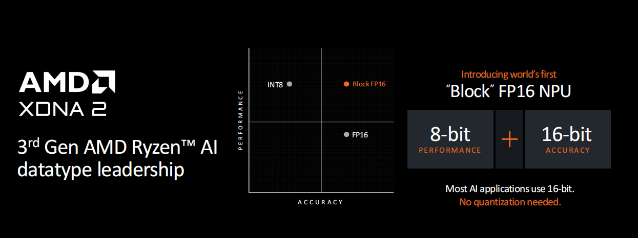 此外,XDNA2还加入了对Block FP16浮点精度的支持,Block FP16浮点精度拥有高于INT8的精度和高于FP16精度的性能,在这两者之间获得了完美的平衡,也拥有更好的灵活性,可以更好地支持多数AI应用使用的16位精度模式以实现最佳效率。