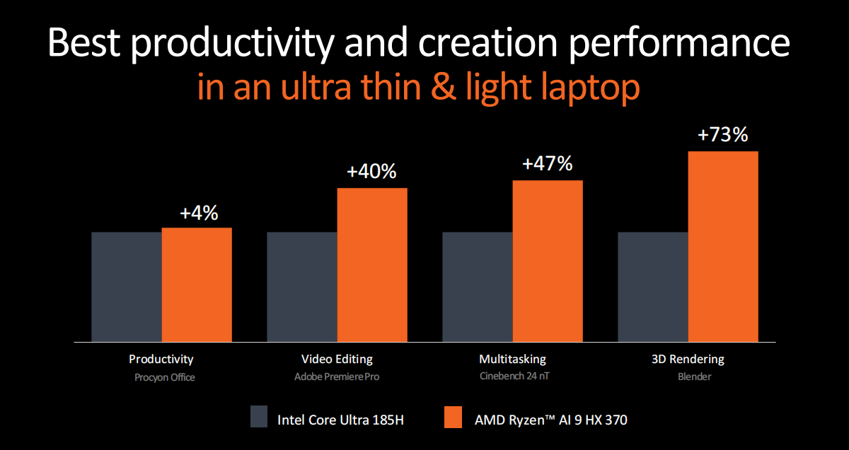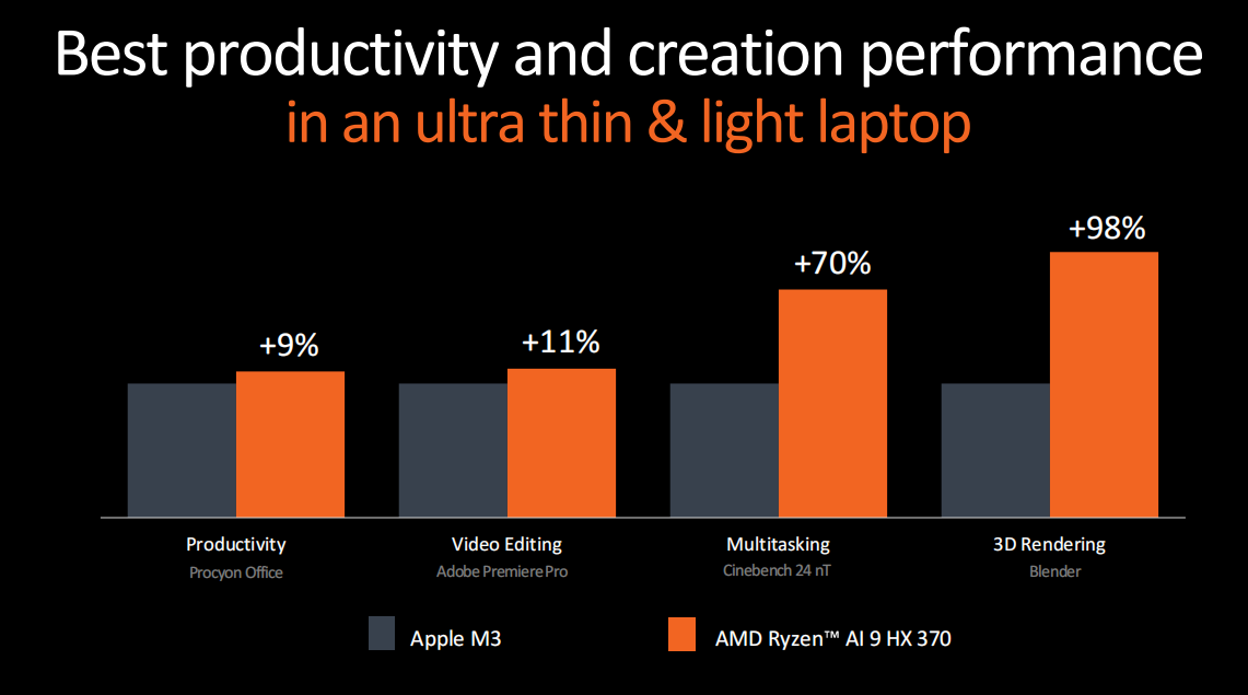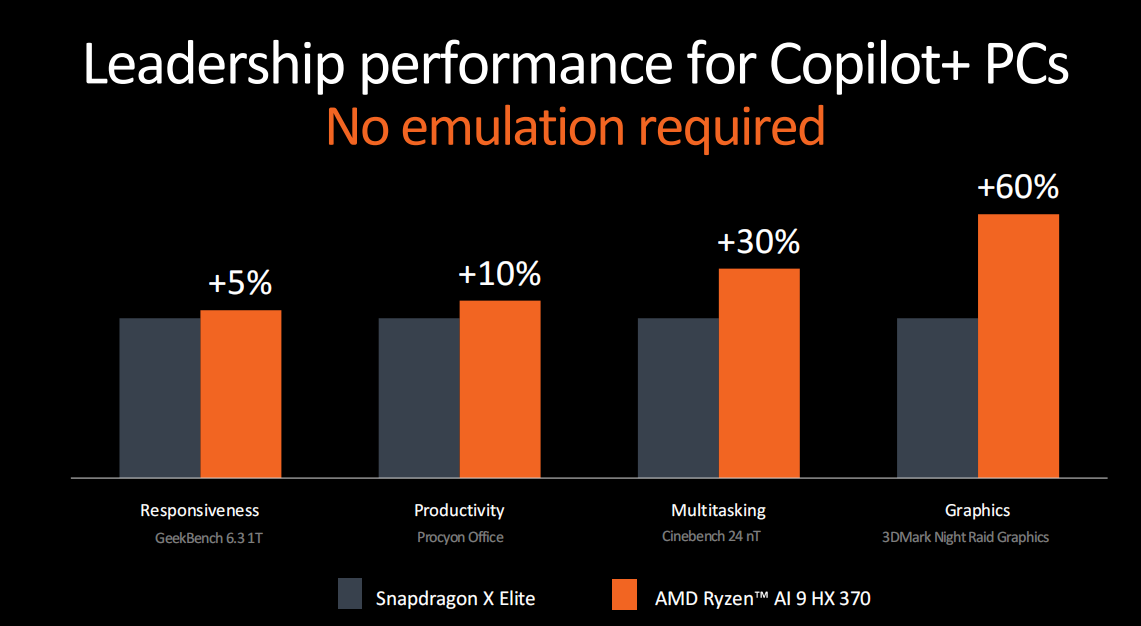 AMD还给出了锐龙AI 9 HX 370与高通骁龙X Elite的性能对比,最高可领先高通骁龙X Elite大约60%,同时锐龙AI 9 HX 370还有个优势就是它本身就是X86处理器,不需要像Arm处理器那样跑模拟器。