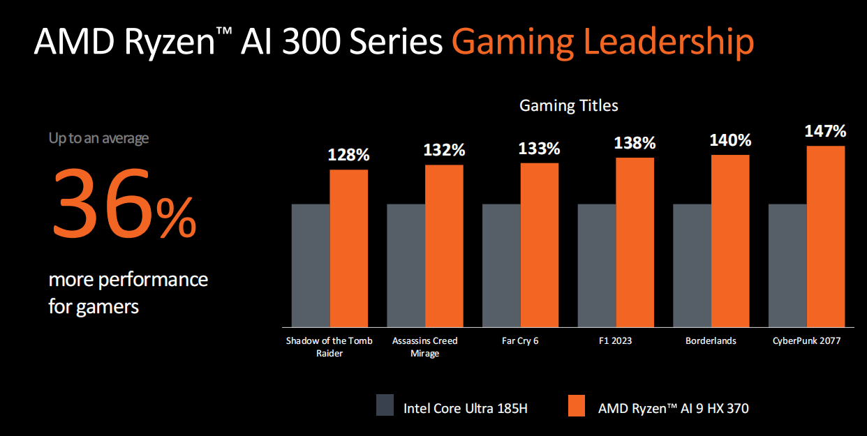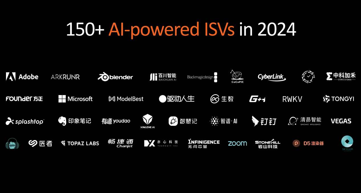 锐龙AI 300所配备的第三代Ryzen AI引擎NPU性能提升可以说是飞跃式的,直接从第二代的16TOPS升级到了50TOPS,甚至已经超过了上代锐龙8040系列的整体算力,这也让配备锐龙AI 300处理器的AI PC轻松达到了Copilot+ PC的标准,对比Intel、高通和苹果的竞品更是遥遥领先。此外,得益于Zen5架构CPU和RDNA 3.5架构GPU的加持,锐龙AI 300同样具备了业界领先的生产力与游戏性能,这也让它在面对传统应用时可以提供极为出色的使用体验和能效表现。此外,在2024年里,将有150+的AI ISV提供商会对Ryzen AI引擎提供支持,这也意味着搭载锐龙AI 300移动处理器的笔记本产品就能使用到这些强大的AI应用功能。