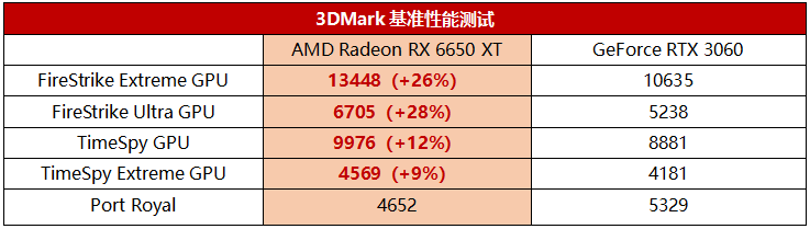 基准测试的分数已经把Radeon RX 6650 XT的定位表现得很清楚了,不管是基于DX11的FireStrike还是基于DX12的TimeSpy,Radeon RX 6650 XT的分数优势都非常明显,其中FireStrike两项测试甚至分别领先RTX 3060 26%和28%,这几乎是领先了两个档次,而TimeSpy部分也有9%~12%的优势,差不多也是高一个档次。其实,Radeon RX 6650 XT把价格放到与RTX 3060实际售价相当的水平上来,对于RTX 3060基本上就是降维打击了,所以有这样的性能优势也在意料之中。Port Royal光追测试的结果也在我们预料之中,不过在实际测试中,情况与之并不相符,后面会有专门的光追游戏测试。