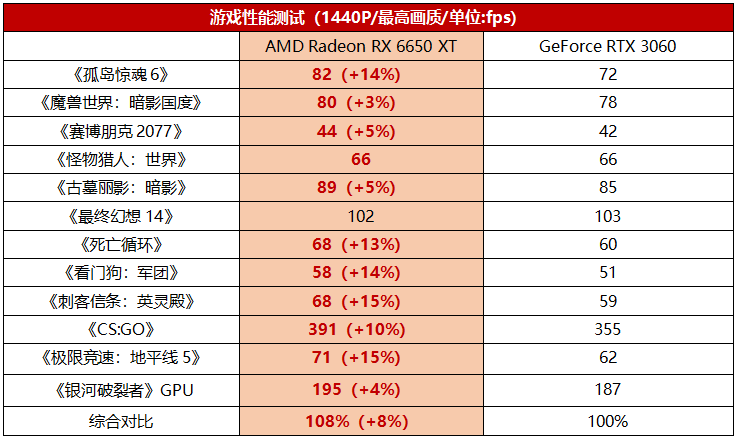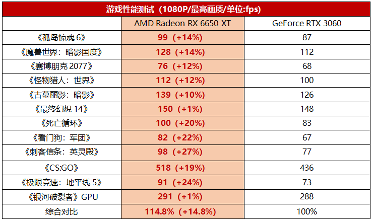 Radeon RX 6650 XT定位1080P极限画质流畅游戏,从我们实测的情况来看,感觉这个要求对它来说有点太低了,所有测试的游戏平均帧率都达到了70fps以上,12款游戏中有7款甚至都达到100fps以上,说它通吃1080P极限画质游戏是没有争议的。同时,Radeon RX 6650 XT相对RTX 3060的优势也非常明显,降维打击的情况显而易见,平均优势达到了14.8%之高,其中《刺客信条:英灵殿》甚至达到了27%,此外还有3款游戏优势超过了20%,6款游戏优势超过了10%。
