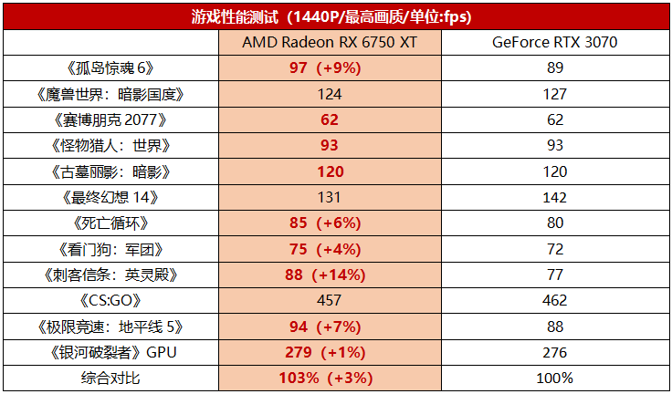 Radeon RX 6750 XT的性能水平定位是1440P游戏应用,在27英寸1440P高刷电竞显示器越来越普及的情况下,玩家对于1440P游戏显卡的需求也越来越旺盛。当然,这也不妨碍1080P玩家选择Radeon RX 6750 XT来追求上百或者几百的电竞级游戏帧率,所以我们也加入了1080P的测试成绩,Radeon RX 6750 XT综合来看领先RTX 3070大约3%,《刺客信条:英灵殿》优势很大,达到了26%。1440P游戏的测试部分,Radeon RX 6750 XT综合来看也领先了RTX 3070大约3%,12款游戏有6款胜出,3款战平。
