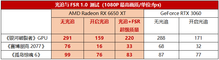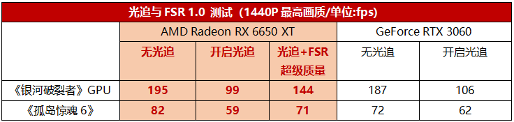 从基准测试的成绩来看,可能大部分玩家还觉得A卡的光追性能对比同级竞品差距还有点明显,但游戏实测的结果并不完全与基准测试符合。首先来看看Radeon RX 6650 XT的表现,三款游戏开启光追后,Radeon RX 6650 XT和RTX 3060的帧率都有明显下降,但我们可以看到在《孤岛惊魂6》中,不打开FSR的前提下,Radeon RX 6650 XT已经基本上与RTX 3060打平了,差异仅有1~2fps,1440P分辨率下Radeon RX 6650 XT的《银河破裂者》光追帧率和RTX 3060也只有几帧的差异,远远没有基准测试那么明显。打开FSR之后,Radeon RX 6650 XT光追设置下的帧率就起飞了,远远超过了RTX 3060光追设置下的帧率。