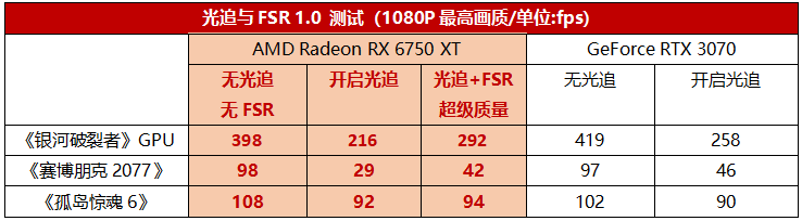 Radeon RX 6750 XT的光追测试结果也比较类似,纯开光追的情况下,与RTX 3070的实测游戏帧率差异并不算大,而开启FSR后,帧率提升幅度明显,大幅度超越了RTX 3070光追下的帧率。