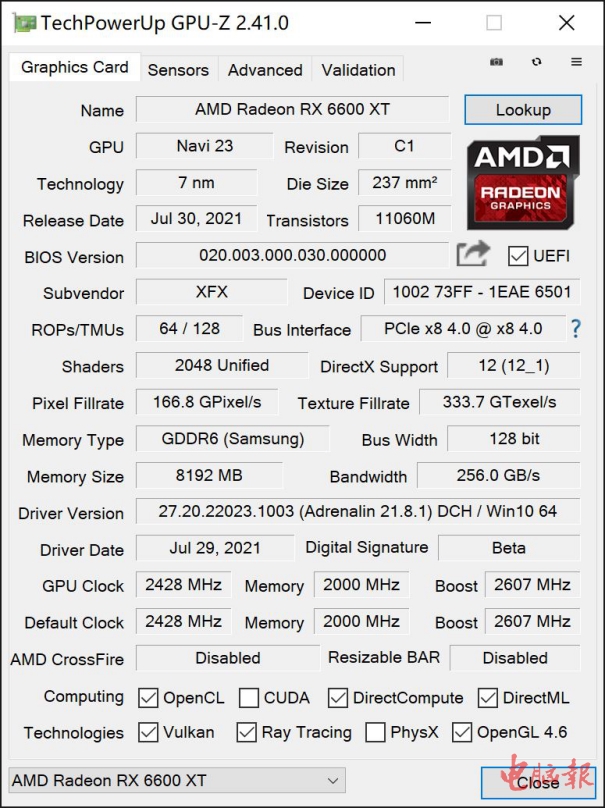 虽然我们可以看到公版设计的RX 6600 XT,但实际上RX 6600 XT公版并不出货。所以大家可以买到的RX 6600 XT均是来自AIB厂商的非公版产品。目前已经有蓝宝石、迪兰、华硕、华擎、微星、讯景、撼讯、盈通等厂商的RX 6600 XT上市。本次测评使用的是来自XFX讯景的RX 6600 XT Speedster MERC308 Black。
