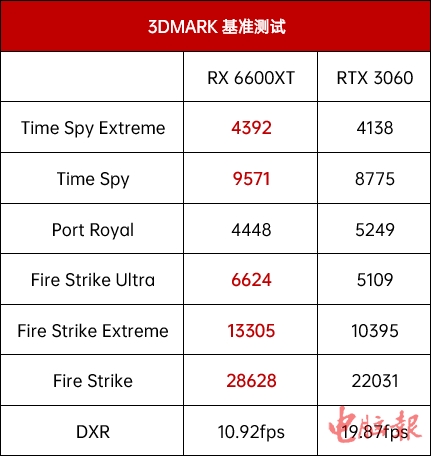而光追性能方面,从之前的测试中我们就知道,这一代AMD显卡的性能和NVIDIA还有较大差距,RX 6600 XT的表现也不例外。在针对光线追踪的Port Royal测试中,RX 6600 XT相比RTX 3060落后了15%,DXR光追测试的落后幅度稍大。根据3DMARK成绩来看,RX 6600 XT在传统的光栅渲染游戏中应该强于RTX 3060,而光追游戏RX 6600 XT则不是RTX 3060的对手。