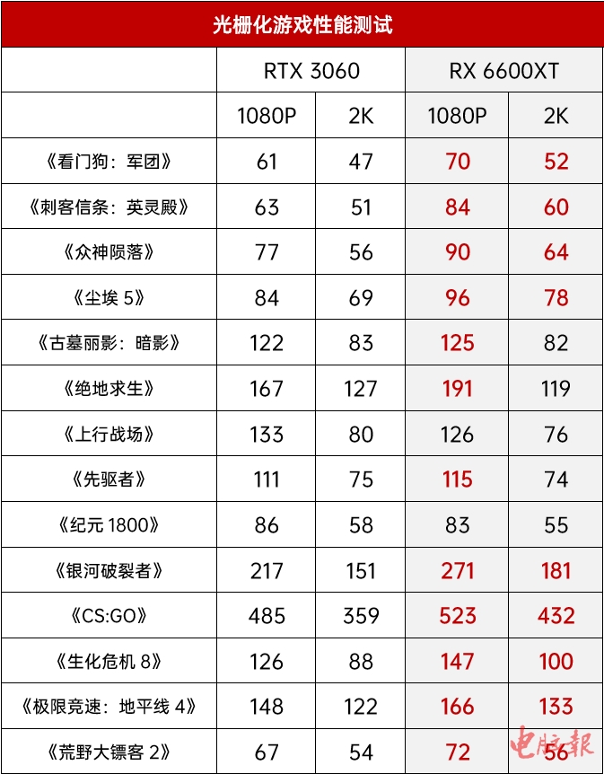 一开始我们通过3DMARK的基准测试就已经了解到了RX 6600 XT的光追性能水平,因此在接下来的光追游戏测试中,我们只重点考查其在1080P分辨率下的光追性能表现。总体来看,RX 6600 XT的光追性能还是符合其定位的,在《尘埃5》里甚至还能反超RTX 3060。
