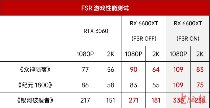 从测试的表现来看,开启FSR功能之后的帧率提升确实很明显,RX 6600 XT的平均帧率提高了20%以上,而且2K分辨率下的提升幅度要大于1080P分辨率。《纪元1800》在开启FSR之后2K分辨率下的提升幅度高达36%,“超级质量模式”下的画质其实也和原生分辨率差别不大,好处是换来了60fps以上的帧率表现。《众神陨落》和《银河破裂者》1080P下的帧率在开启FSR之后分别达到了109fps、333fps。