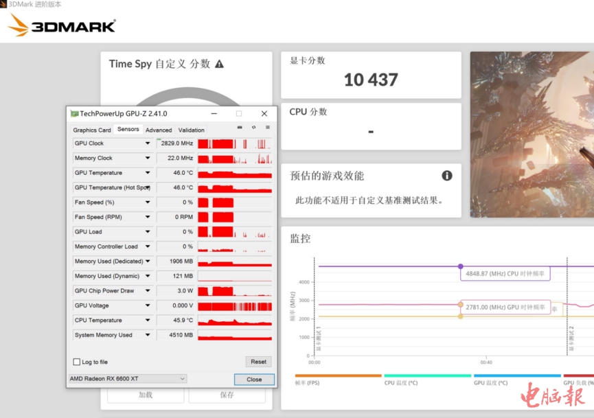 AMD这代显卡超频能力非常不错。在显卡驱动中,我们使用自动超频,驱动给出的频率为2719MHz。所以我们直接就把频率拉到了2750MHz,轻松跑过测试。最后我们这块卡可以稳定的跑在核心频率2830MHz/显存频率2150MHz上,TimeSPY的成绩从默认的9571直接暴涨近1000分达到了10437。