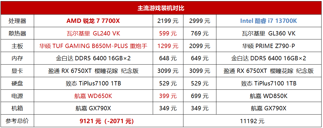 最后,我们还列出了两套比较典型的8核U游戏装机配置。从表中可以看到,锐龙7 7700X这一套配置得益于处理器出色的能效比,可以在电源与散热器方面节约一部分预算,同时主板和处理器的价格也相对酷睿i7 13700K平台有明显优势,这就使得对比整机总价的话,锐龙7 7700X这套配置相对酷睿i7 13700K方案拥有了2071元的巨大优势,玩家用这笔预算还可以继续升级显卡或者显示器获得更好的游戏体验。