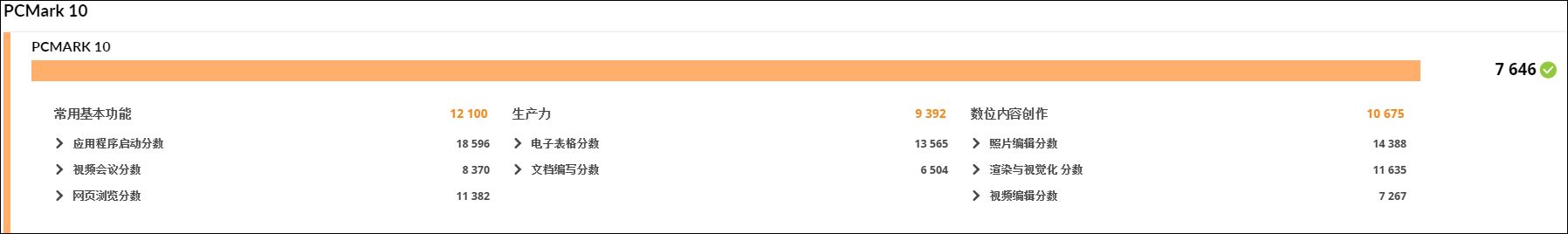 PCMark10办公性能测试就是一个涵盖了Office办公、网页浏览、视频播放等应用的项目,包括大家熟悉的Office三件套(Word、Excel、PowerPoint)等。这些测试总共包括三个大的子项目:常用基本功能(程序启动、视频会议、网页浏览)、生产力(表格和文档)、数位内容创作(照片编辑、渲染和视频编辑)。ThinkStation P3 Ultra的总分数是7646,三个子项目的分数分别是12100/9392/10675,而软件出品方提供的建议分数则是4100/4500/3450,显然,用该机来做这些轻度的日常办公应用,完全是信手拈来。