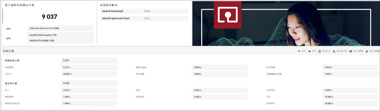 照片处理同样是很多用户在工作和生活中都会经常遇到的应用,UL的照片基准测试是考查电脑利用Ps和Lr处理照片能力的水平,ThinkStation P3 Ultra拿下了9037的高分,在调色、输出等各项操作中都能实时响应,例如在处理大量的同一场景拍摄的照片时,我们经常会用同一套预设,该机的响应时间是0.347s,应对这类应用非常轻松。