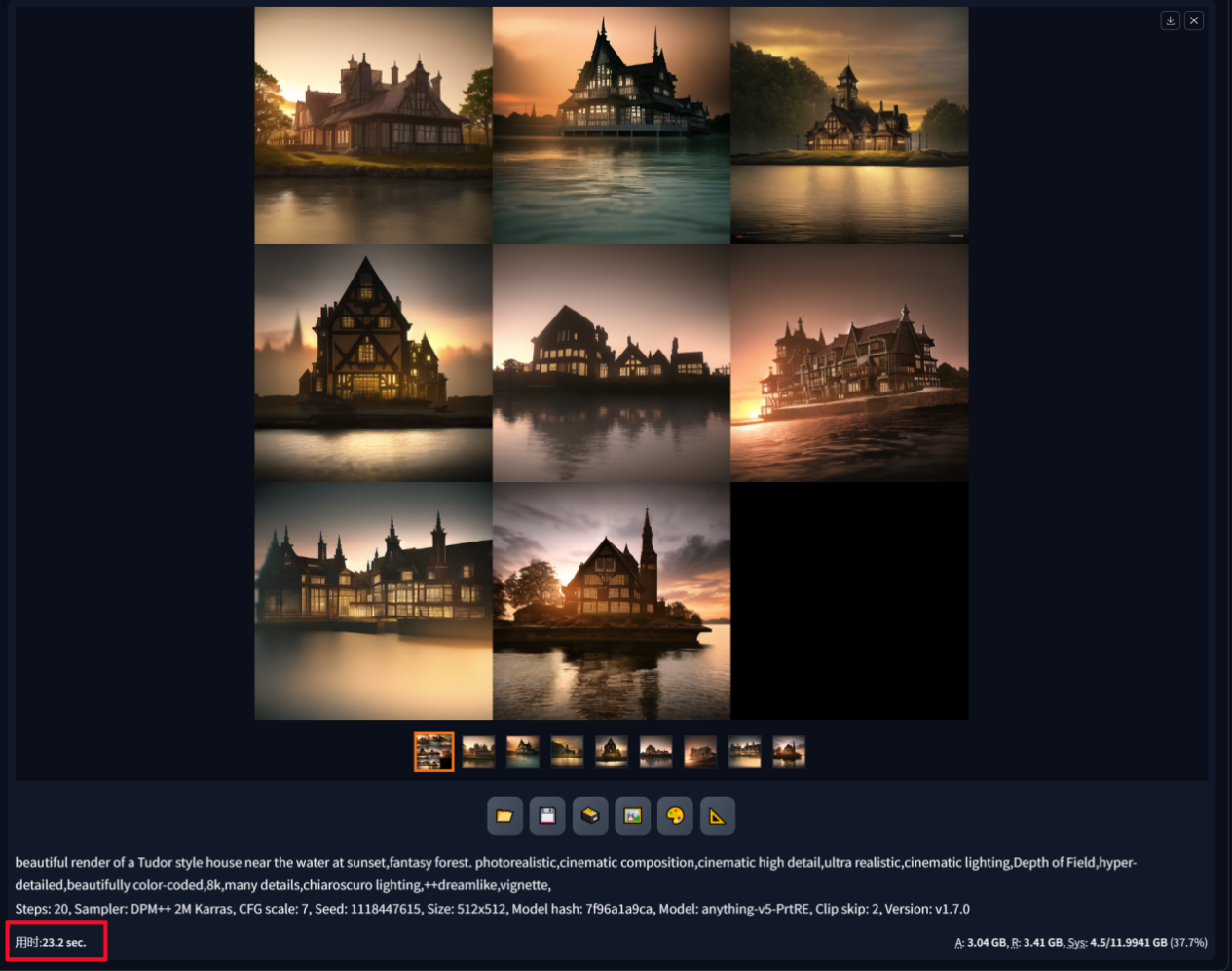 2024年是AI PC元年,Stable Diffusion是当下非常流行的AI创作工具,而说到AI出图,更是NVIDIA GPU的拿手好戏!打开应用之后运行AI文生图,图片规格为512×512分辨率,批次数量为1,单批数量为8,也就是一次性生成8张512×512的图片。采用NVIDIA RTX A2000输出,最终生成时间为23.2秒,单张出图效率在3秒左右,GPU显存占用为4.5GB,这对于拥有12GB大显存的NVIDIA RTX A2000来说算是小菜一碟。作为对比,同样的设置下,如果采用顶级的24核32线程处理计算,单张都需要1分53秒,显然,如果用户有利用AI出图的工作与应用,那么NVIDIA RTX独显才是真正的高效率利器。