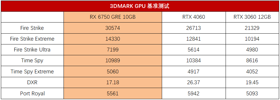 3DMARK GPU基准测试中,RX 6750 GRE 10GB在FireStrike系列测试中最高领先RTX 4060约28%,平均领先约18%,而对比RTX 3060 12GB,平均领先幅度则达到了约43,最高领先45%以上。DX12的Time Spy系列测试中,RX 6750 GRE 10GB平均领先RTX 4060约4%,领先RXT 3060 12GB约26%。在针对光线追踪的DXR测试中,RX 6750 GRE 10GB分别落后RTX 4060和RTX 3060 12GB 35%、12%,Port Royal测试中,RX 6750 GRE 10GB落后RTX 4060 6%,领先RTX 3060 12GB 9%。