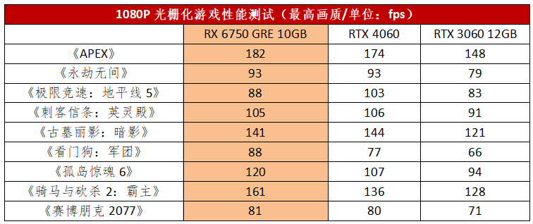 从帧率上来看,RX 6750 GRE 10GB在1080P分辨率下,其平均游戏帧率超过了100fps。2K分辨率下,除了《赛博朋克2077》,都可实现60fps以上的流畅帧率。而RTX 3060 12GB在2K分辨率下有3款游戏的帧率都在60fps以下,游戏性能明显超过RTX 3060 12GB。对比RTX 4060也互有胜负,在参测的几款游戏中,RX 6750 GRE 10GB的优势甚至更大,游戏性能表现非常不错,考虑到两款显卡的价格差异,更凸显了RX 6750 GRE 10GB的性价比。