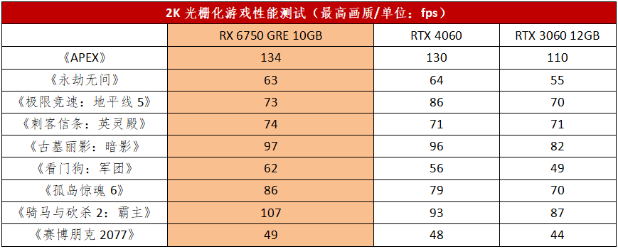 实际的游戏方面,在光栅化游戏性能测试中我们可以看到,RX 6750 GRE 10GB不论是面对RTX 3060 12GB还是RTX 4060都有比较大的领先优势。在1080P分辨率下,RX 6750 GRE 10GB平均领先RTX 3060 12GB约20%,对比RTX 4060的话,RX 6750 GRE 10GB在大部分游戏中都强于RTX 4060,平均领先RTX 4060约4%。而在2K分辨率下,RX 6750 GRE 10GB平均领先RTX 3060 12GB约16%,领先RTX 4060约3%。