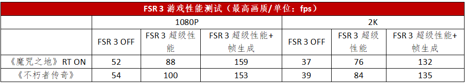 接下来,我们在支持FSR 3的两款游戏《魔咒之地》和《不朽者传奇》中进行了测试。在1080P分辨率下,《魔咒之地》《不朽者传奇》两款游戏的FSR 3+帧生成的帧率提升分别为206%、183%。在2K分辨率下,《魔咒之地》打开FSR 3超级性能模式后帧率从37fps提升到了76fps,打开帧生成之后帧率暴涨至132fps,相比原生分辨率提升了206%。《不朽者传奇》的FSR 3超级性能模式为84fps,打开帧生成之后的帧率达到了135fps,相比原生分辨率提升了246%,性能提升巨大。