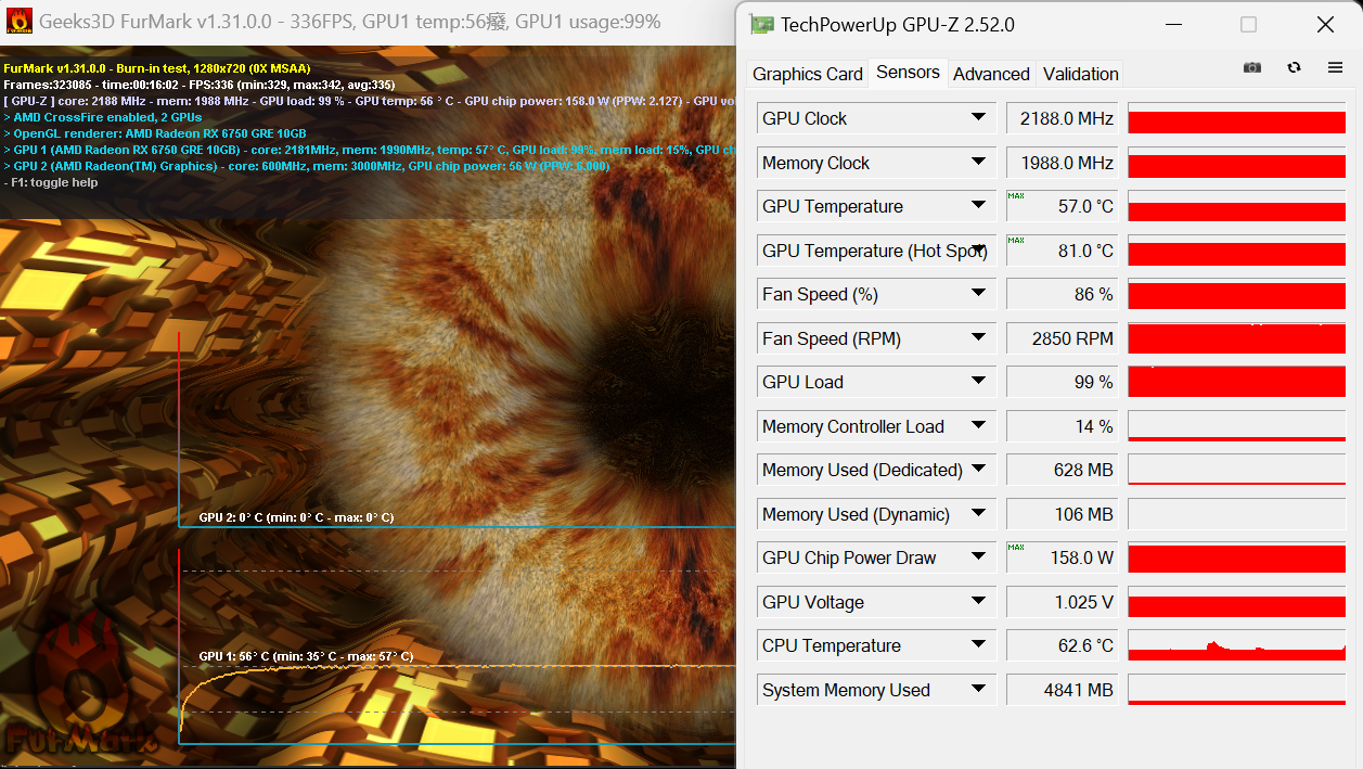 在温度和功耗测试部分,我们在23℃的测试环境中,使用Furmark连续考机30分钟。在默认的风扇设置下,蓝宝石RX 6750 GRE 10G D6白金版的最高考机温度为69℃,而此时风扇转速只有1336RPM,几乎听不到风噪声。如果我们手动把风扇转速拉到最大,那显卡的最高温度就只有57℃了,热点温度为81℃,散热表现比较出色。同时可以看到蓝宝石RX 6750 GRE 10G D6白金版的峰值TGP只有158W,这款蓝宝石显卡不仅性能强,还很节能静音,温度和能耗比表现非常不错。