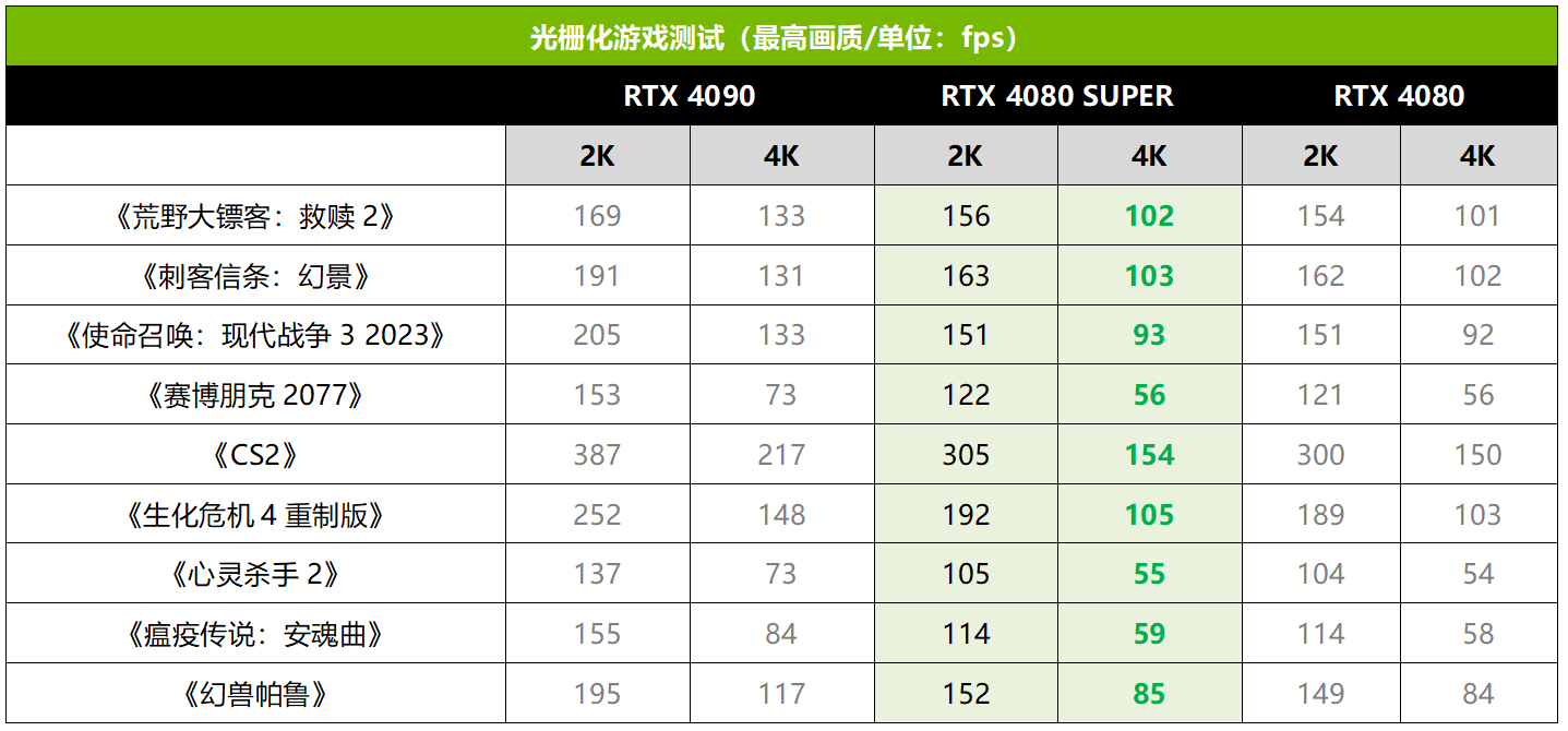 光栅化游戏实测部分,可以看到RTX 4080 SUPER在4K分辨率下的性能十分可观,除了极少数要求极高的游戏大作之外,其它游戏的帧率都能保持在80fps以上,流畅度是非常OK的。当然,这些硬件杀手级游戏是支持DLSS的,打开后RTX 4080 SUPER就能确保完全流畅。2K分辨率下RTX 4080 SUPER就毫无压力了,毕竟是定位4K游戏,要搞定2K游戏自然轻而易举,所有游戏都可以保持100fps以上的帧率,电竞游戏更是高达几百帧。