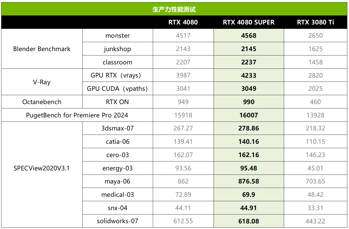 生产力方面,RTX 4080 SUPER拥有16GB大显存和完整的AD103核心,因此效率方面也是非常可观的。从Blender、V-Ray和Octanebench测试来看,最高领先了RTX 3080 Ti大约115%,最低也有32%的优势,可以说相当强悍了。如果加上SPECView和 Premiere Pro 2024的成绩进行对比,RTX 4080 SUPER的生产力性能大约是RTX 3080 Ti的147%之多,相对RTX 4080也有一定的提升。