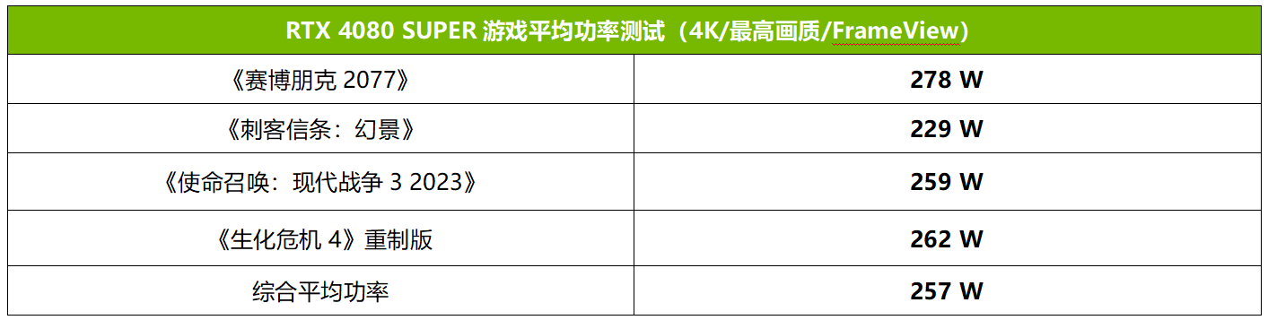 功率方面,从我们用NVIDIA FrameView工具监测的情况来看,4款游戏大作中RTX 4080 SUPER的平均游戏功率最高278W,最低229W,综合平均下来为257W,与标称的平均功率相差不大,只有320W整板功率的80%,可见RTX 4080 SUPER的能效表现也是非常出色的。
