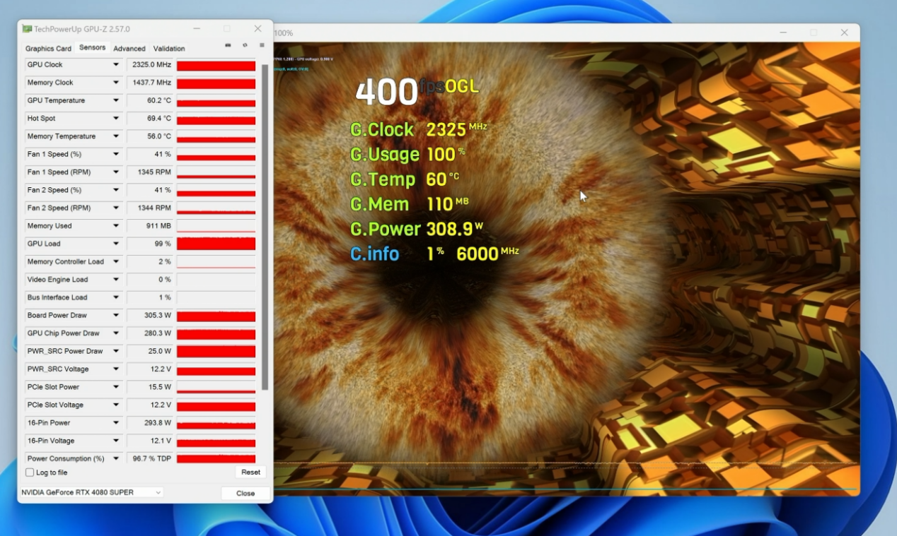 用FurMark考机半小时,可以看到TUF GAMING RTX 4080 SUPER的满载功率保持在305W左右,核心温度60.2℃、热点温度69.4℃、显存温度56℃,对于一块300W级的高端显卡来说,这个散热效果是相当不错的。