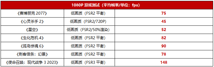 此外,大家不要忘了Radeon 780M也可以通过FSR来提升游戏帧率。从测试来看,开启FSR之后,Radeon 780M甚至可以让《赛博朋克2077》跑到75fps的平均帧率,《心灵杀手2》《星空》也达到了可以顺畅游玩的水平,其他大作都达到了75fps以上的高帧率,流畅度是非常OK的。