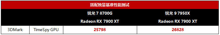 那么,锐龙7 8700G如果搭配强力独显使用效果又如何呢?从我们的对比来看,锐龙7 8700G搭配RX 7900 XT的性能表现与锐龙9 7950X搭配RX 7900 XT的性能表现仅有不到4%的差距,可见选择锐龙7 8700G以后再升级强力独显也是完全可行的,不会有瓶颈问题。