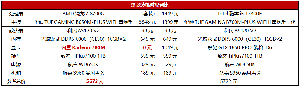 上面表中是最近火热的锐龙7 8700G装机配置与电商平台热门的酷睿i5+GTX 1650独显配置对比。从整机价格来看,目前由于锐龙7 8700G正在热销,电商平台有处理器+主板的超值套装,因此性价比进一步提升,甚至相对同定位的酷睿i5+GTX 1650独显配置还有49元的价格优势。此外,从这两套配置的实用性、升级空间来对比,也是锐龙7 8700G主机更优,毕竟除了Radeon 780M核显在DX12U引擎的新游戏中表现优于GTX 1650独显之外,它还能无缝升级任何强力独显(核显也能同时使用,甚至在某些支持独占全屏模式的游戏中还能通过AFMF功能给独显插帧提升性能),而GTX 1650独显已经占掉了显卡插槽,未来升级强力独显,这块GTX 1650独显也只能被淘汰,等于浪费了投资,非常不划算。