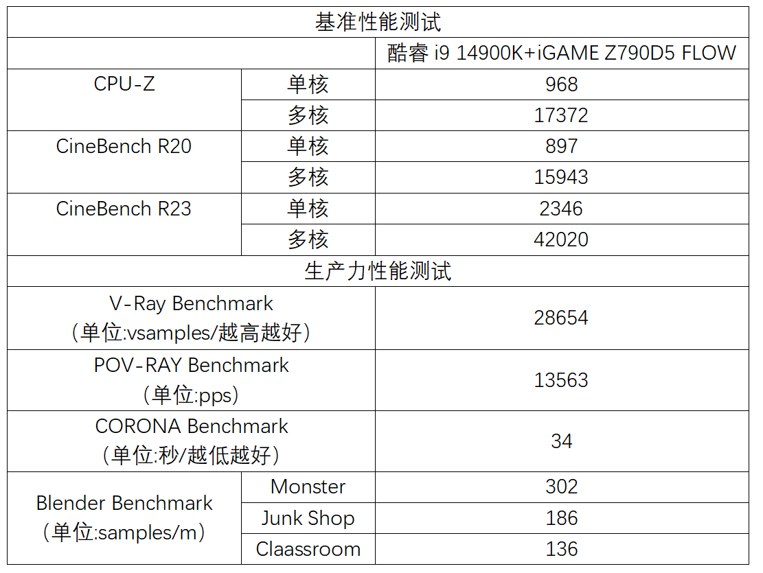 在处理器基准性能测试中,酷睿i9 14900K处理器在《CPU-Z》《Cinebench R20》《Cinebench R23》中的都展现出了强悍的性能。而在生产力性能方面,酷睿i9 14900K在各种生产力软件中的成绩也非常优秀,再加上高频DDR5内存带来的大带宽,对于专业应用也有一定的加成,有超频需求的玩家,还可以在七彩虹iGAME Z790D5 FLOW V20的BIOS中手动超频,从而获得更好的性能体验。