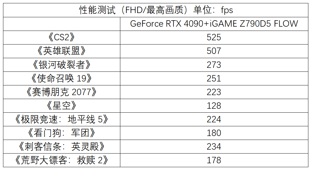 在游戏性能方面,七彩虹iGAME Z790D5 FLOW V20主板的表现同样出色,酷睿i9 14900K处理器和GeForce RTX 4090显卡的性能都得到了充分地发挥,表明了主板在各种性能的呈现上没有明显的短板。总的来说,七彩虹iGAME Z790D5 FLOW V20主板的表现非常出色,即便是搭配旗舰处理器和旗舰级显卡也能充分发挥出性能。