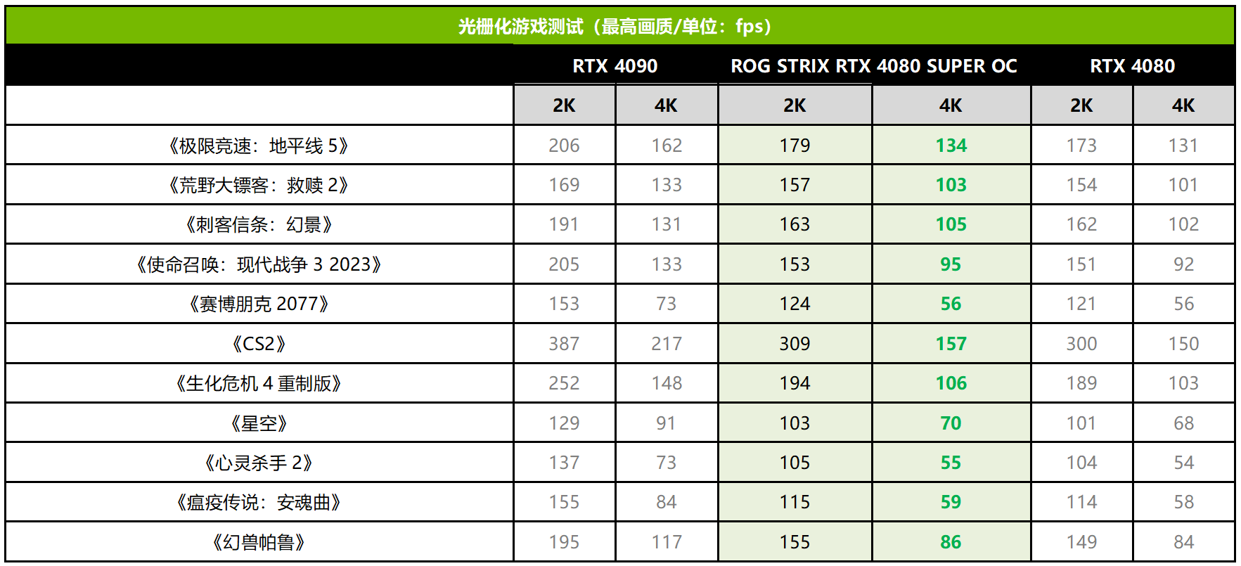 接下来我们进入实际的游戏测试,首先是光栅化游戏。在2K分辨率下,RTX 4080 SUPER的平均帧率相对RTX 4080提升了3%左右,可以达到RTX 4090约86%的性能。随着分辨率来到4K,领先幅度缩小到2%左右,达到RTX 4090约78%的性能。即使是在4K分辨率下,其平均游戏帧率都可以达到93fps以上,流畅运行3A游戏大作没有什么问题。