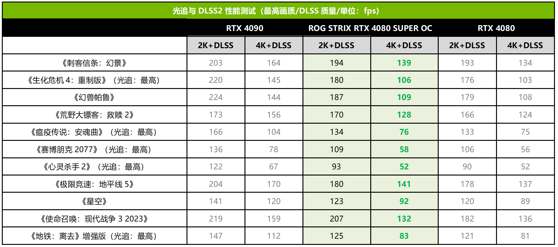 DLSS 3是RTX 40系列的重头戏,目前也有很多游戏大作都添加了对DLSS 3的支持,这次我们也选择了几款游戏进行测试。可以看到,RTX 4080 SUPER不管在2K分辨率还是4K分辨下,在采用同样的画质设定时,开启DLSS 3后的游戏帧率能在DLSS 2的基础上平均再高出34%,其中提升最大的《心灵杀手2》,开启DLSS 3的帧率比DLSS 2高了57%。帧率方面,在DLSS 3的加持下,《赛博朋克2077》《心灵杀手2》的帧率都从60fps以下跃升到80fps以上的流畅帧率,帧率提升效果相当明显,可以说完全征服了4K光追游戏。