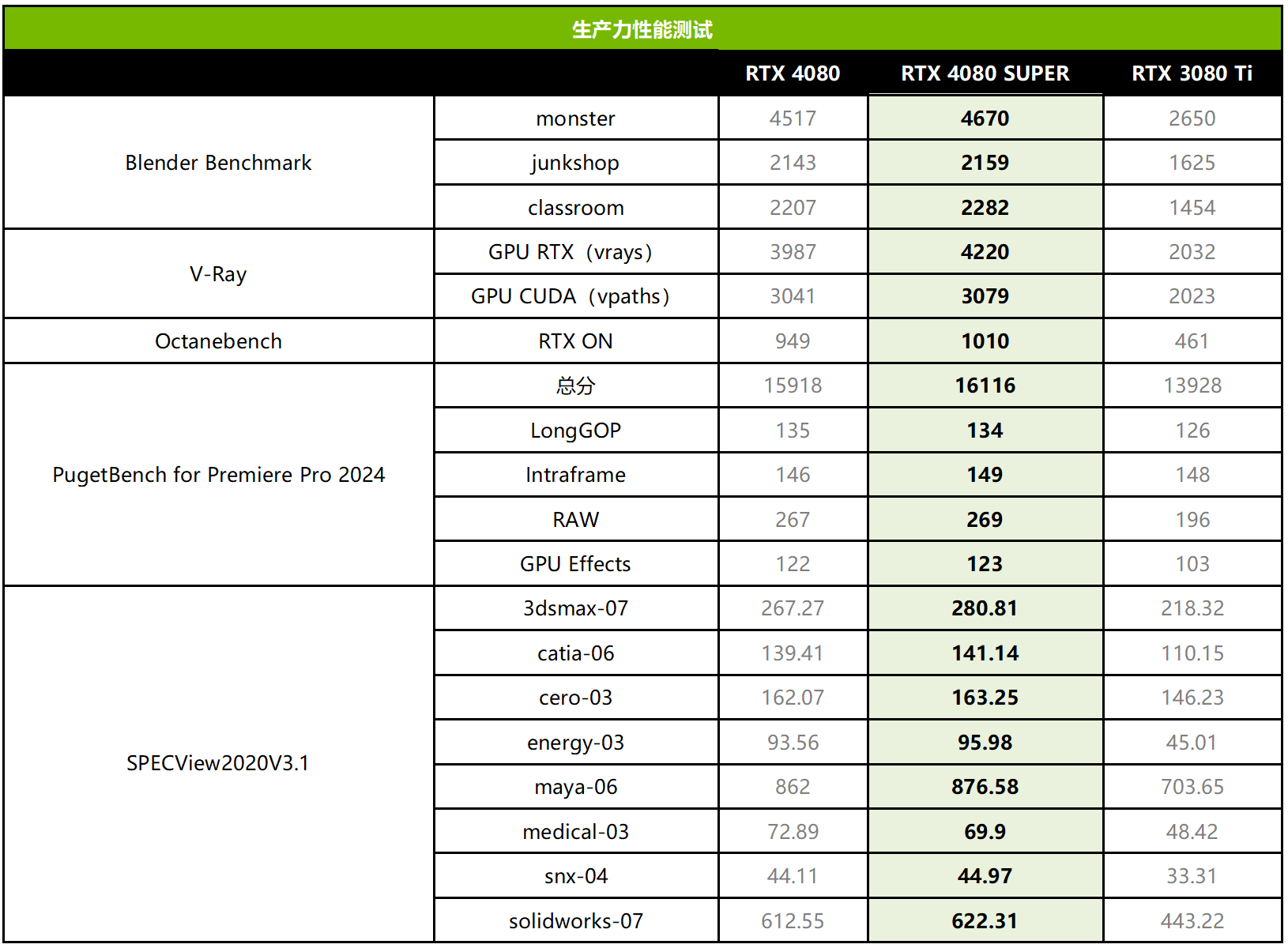 生产力性能方面,从测试结果可以看到,RTX 4080 SUPER相对于RTX 3080 Ti,在Bnelder、V-Ray、Octanebench的大多数渲染测试项目中有50%以上的性能提升,最大提升超过119%。PugetBench for Premiere Pro 2024中有1%~37%的提升。SPECView测试中,领先RTX 4080 Ti的幅度平均达到41%,最高可达113%,提升非常大。如果对比RTX 4080的话,综合也有2%左右的提升。