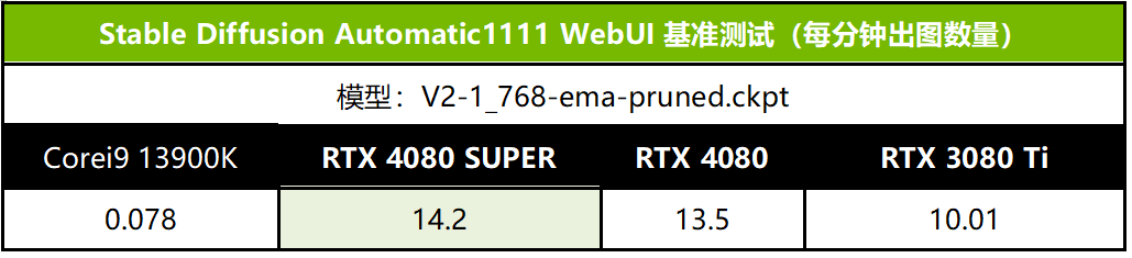 RTX 4080 SUPER具备16GB超大显存,算力也相当出色,非常适合用来完成Stable Diffusion本地出图任务。这里我们选用Stable Diffusion Automatic1111 WebUI来对RTX 4080 SUPER的出图效率进行测试。从测试成绩可以看到,RTX 4080 SUPER每分钟可以出图14.2张,是i9 13900K纯CPU方案的182倍以上,领先RTX 3080 Ti 大约42%,比RTX 4080提升了约5%。