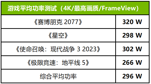 从我们用NVIDIA FrameView工具监测的情况来看,ROG STRIX RTX 4080 SUPER OC在4款游戏大作中的平均游戏功率为296W,考虑到强悍的性能输出,这样的能效比表现也是很出色的。