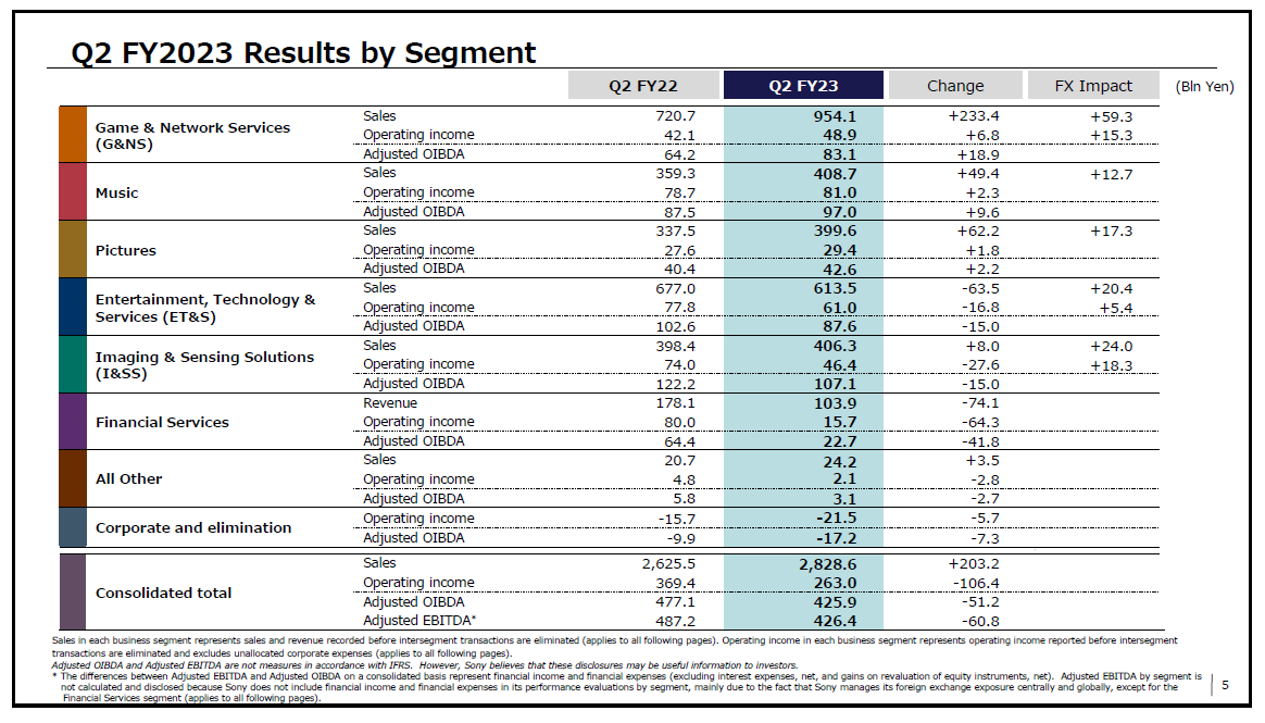 (日本,东京)—— 索尼集团公司(下称:索尼)今日公布2023财年第二季度(2023年7月1日——2023年9月30日)业绩数字,如下: