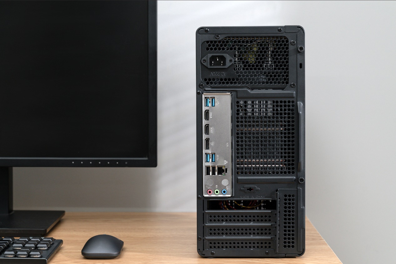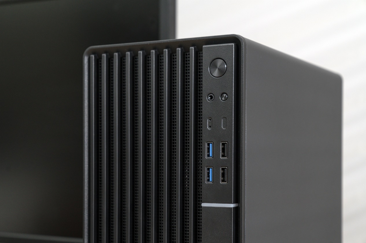 配置方面,尔英商务主机 “该省的省,该花的花”,外观上面简约且高级,流线形过渡的纯黑机身、正面的竖条格栅,让机身的商务质感拉满。机身钢板厚度也很厚实,不是那种百元机的便宜机箱可比的,并且在风扇、显卡、硬盘预装位置,机身都预留了足够的螺丝孔位。
